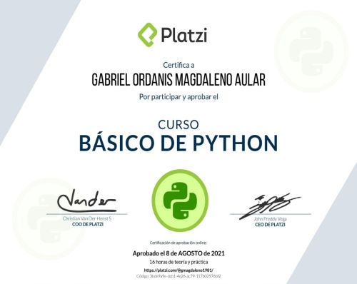 Certificado obtenido en Platzi al culminar curso Basico de Python.